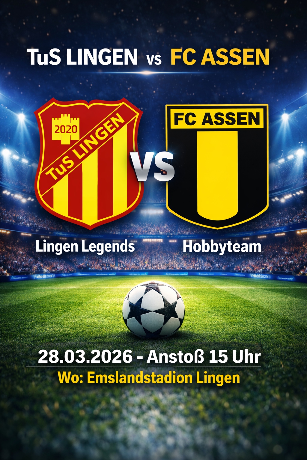 Am Samstag, den 28. März 2026, steht im Emslandstadion in Lingen ein besonderes Fußballspiel auf dem Programm. Um 15:00 Uhr treffen die TuS Lingen Legends auf die Hobbymannschaft des FC Assen aus den Niederlanden.